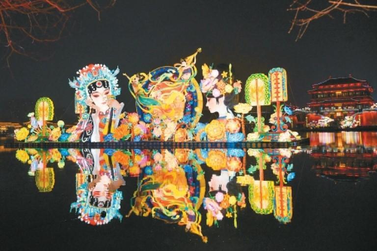 西安大唐芙蓉园内芙蓉湖上的巨型花灯。(记者郝钟毓 摄)