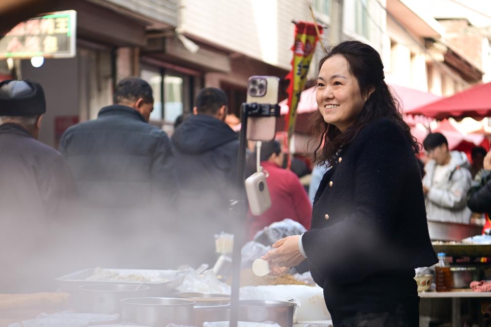 2月13日,游客在焦岱大集上品尝特色小吃。