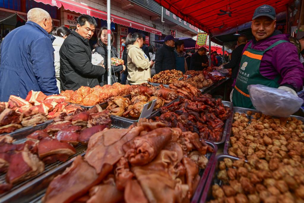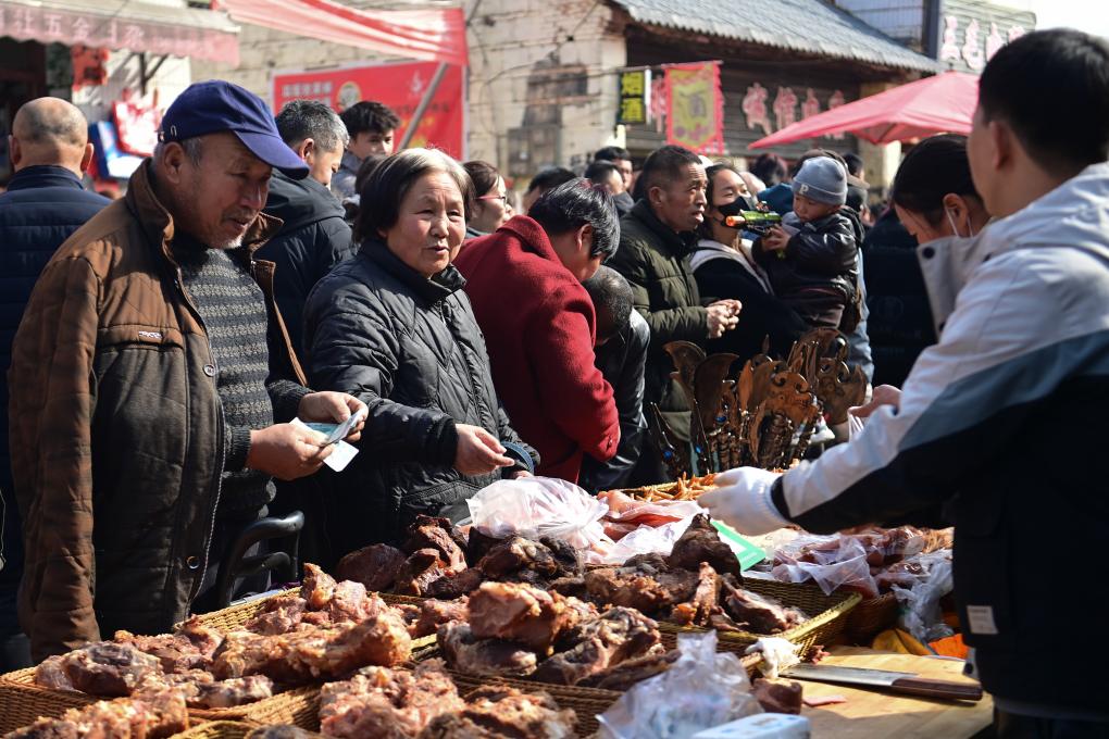 2月13日,游客在焦岱大集上选购特色食品。