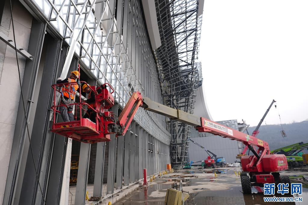 2月26日,工人对西安东站外立面进行幕墙安装作业。