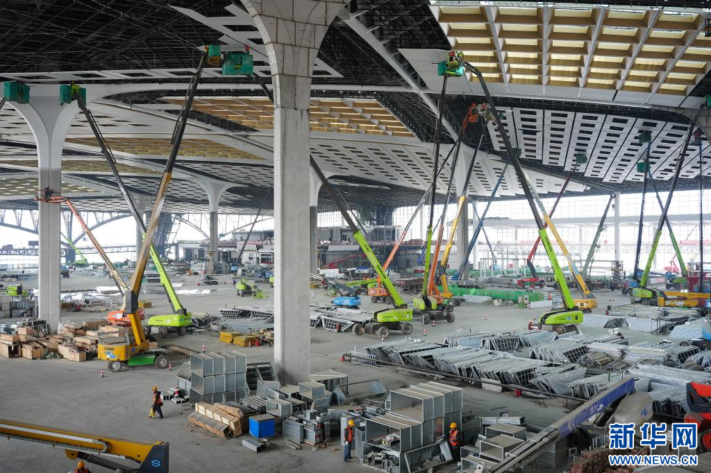 2月26日,工人在西安东站候车大厅内部进行吊顶安装。
