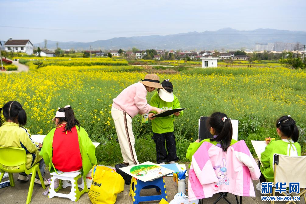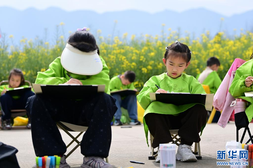 3月28日,学生在汉中市西乡县杨河镇高土坝社区油菜花观花点画画。