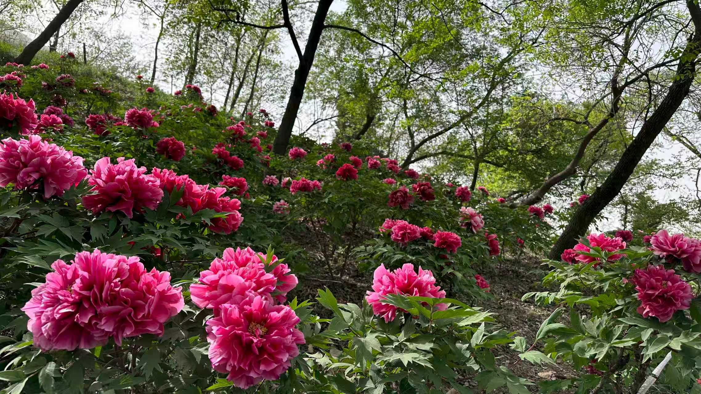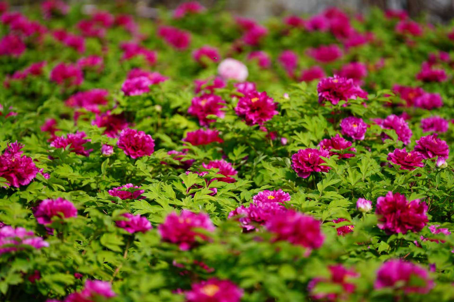 牡丹花沿着山势梯田层叠,竞相绽放。