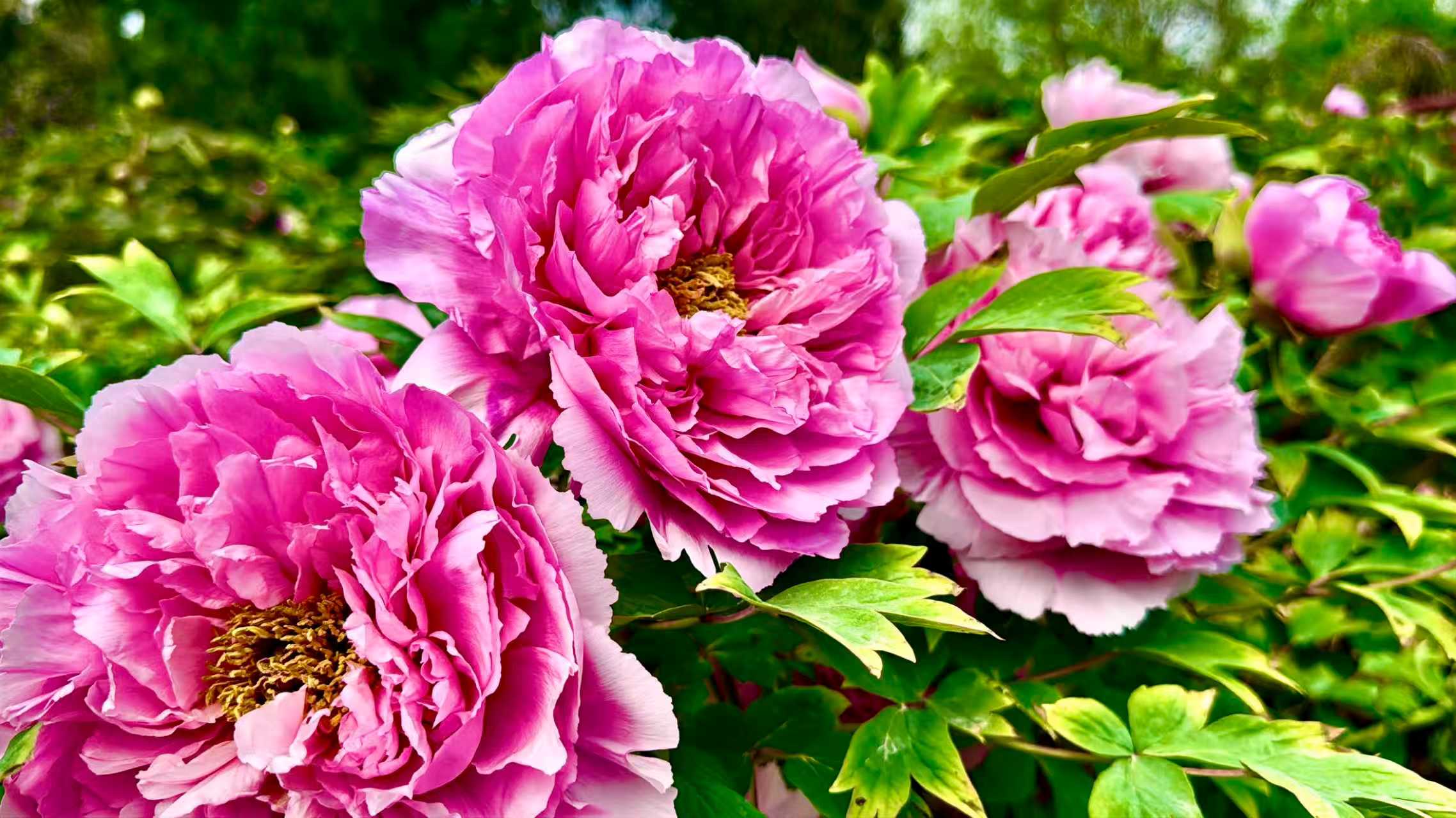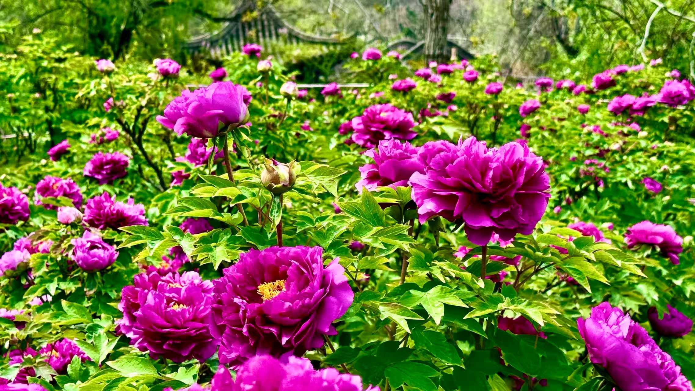 满园的牡丹争奇斗艳,吸引游客前来赏花游玩。