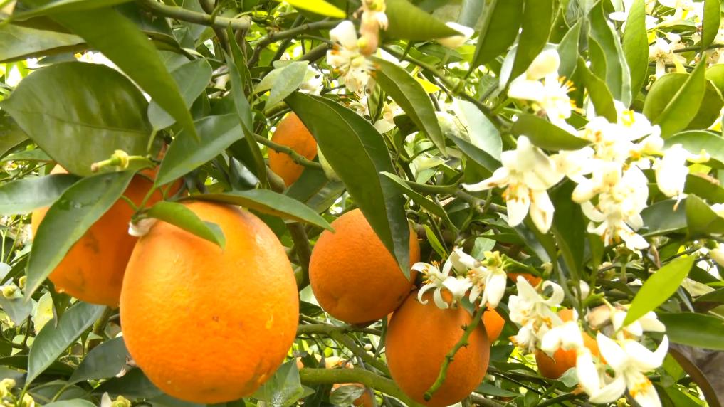 在泸县牛滩镇的千亩柑橘产业园,金黄的晚熟血橙与洁白的花朵同树。